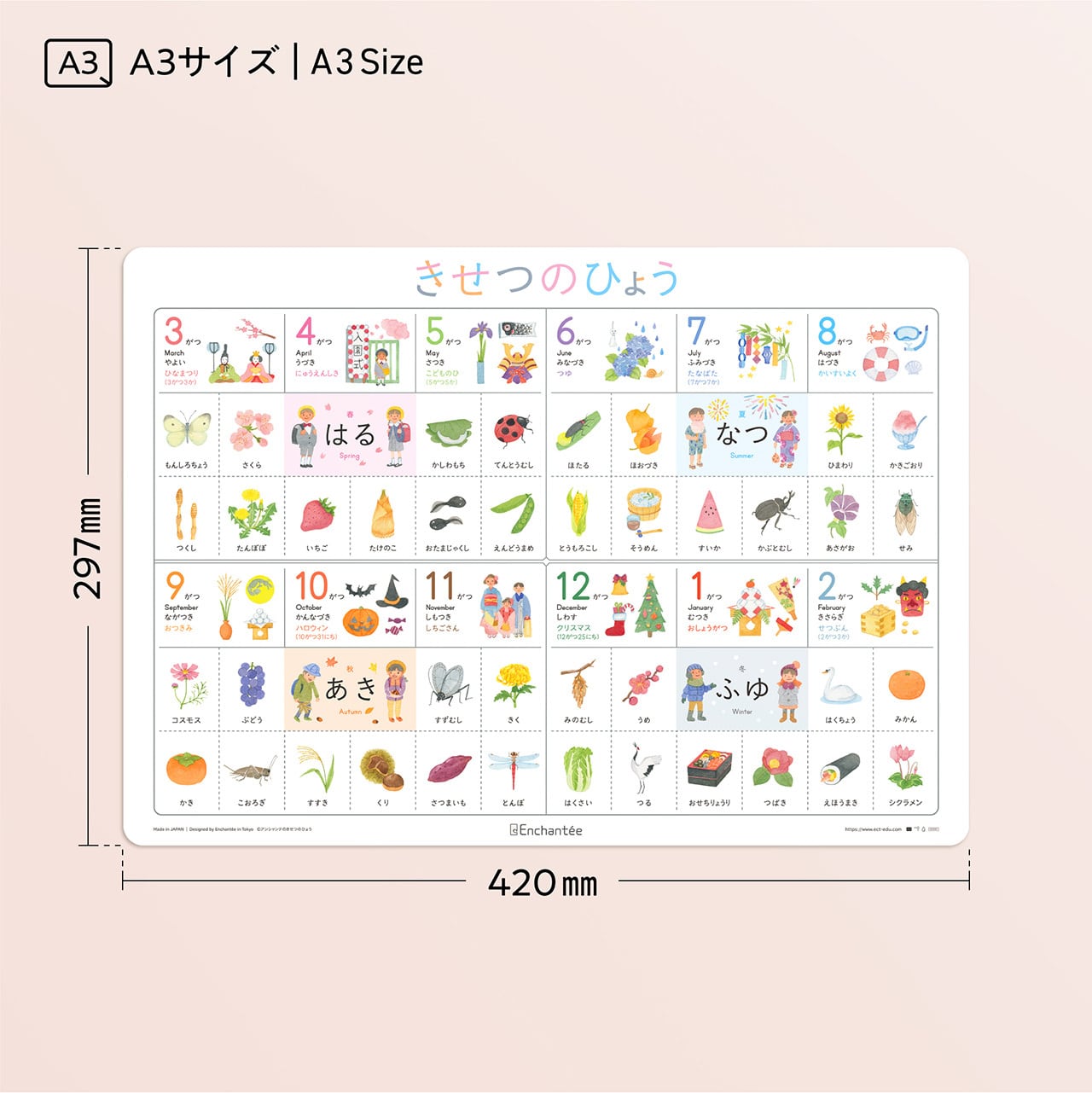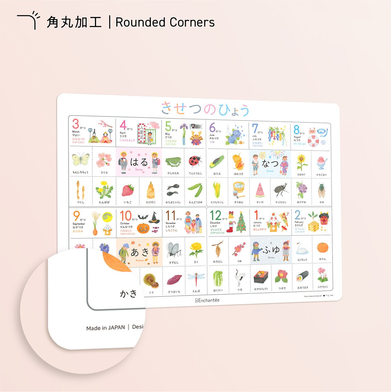 「アンシャンテのきせつのひょう」は、日本の四季と伝統文化を学ぶのに最適な教材です。A3サイズで、角丸加工を施し、耐水性・耐久性のあるユポ紙を使用しておりますので、日常のさまざまなシーンで安心してお使いいただけます。